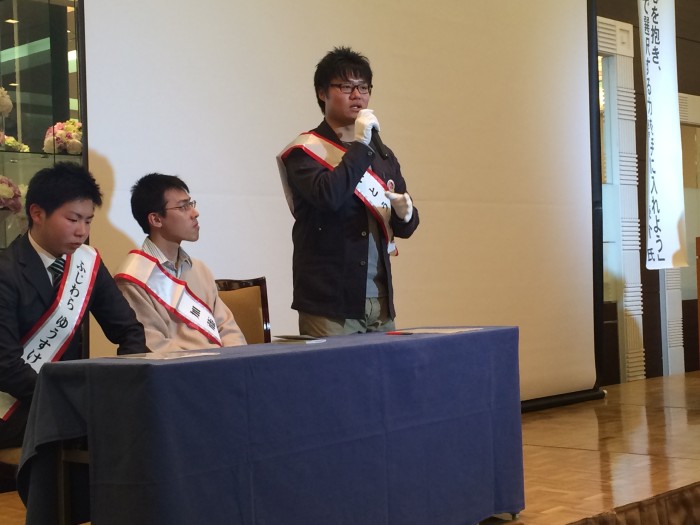 大学生による模擬選挙。秋田の未来に対して、自分の政策を発表しています。