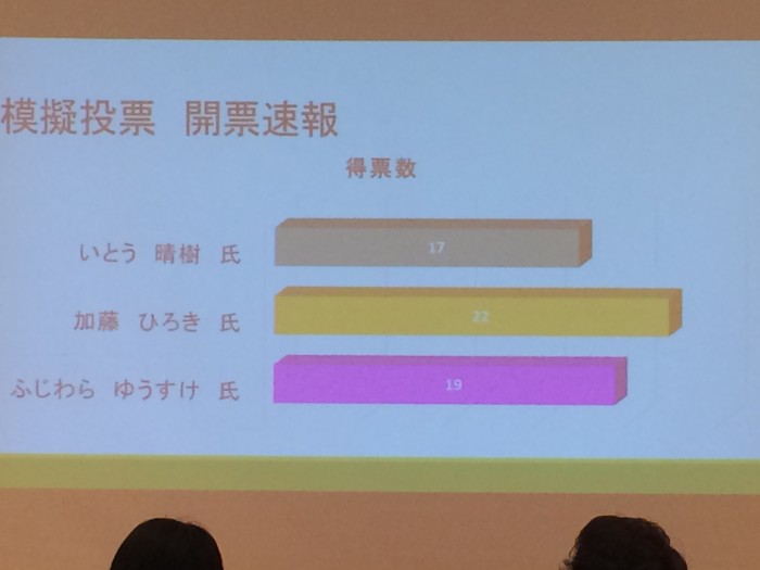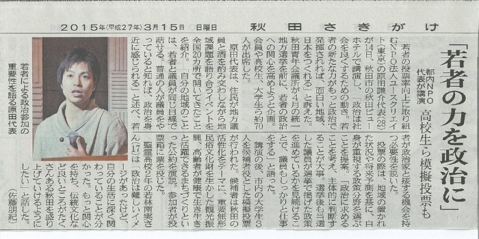 前半は原田氏の活動や若者に政治に興味を持ってもらうための手法や自らの体験をお話ししていただき、後半は秋田大学やノースアジア大学の学生による模擬選挙を行いました。