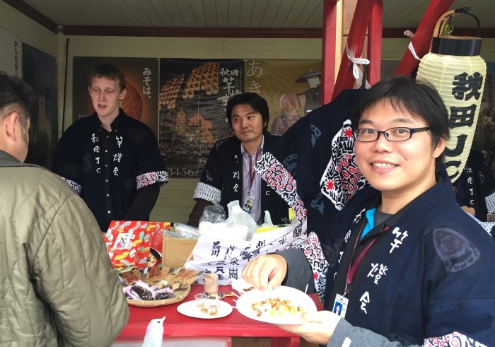 二つ目はフェスティバル会場内での秋田の観光・物産PRブースの出展です。パンフレットやDVDを活用し、秋田の観光や日本酒等についての紹介を行いました。また、「いぶりがっこ」や「みそ漬け」、「もろこし」を試食品として提供しました。多くの方に興味を持っていただき、様々な質問を受けましたが、日本語を専攻している現地の大学生ボランティアに通訳をしていただき、言葉の壁を気にすることなくPRをすることができました。