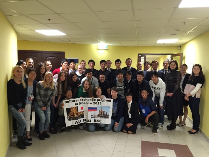 三つ目は秋田とモスクワの大学生同士の学生交流です。国際教養大学とノースアジア大学の学生17名とロシア国立研究大学モスクワ高等経済学校の学生15名とで教育・連絡・結婚・就職といった身近な話題をテーマに行いました。4グループに分かれてディスカッションをしていくと、テーマに対する共通点や相違点が色々とわかり、段々と深い議論となっていました。最後にそれぞれのディスカッションの結果を発表するころには、お互いがすっかり打ち解けていました。