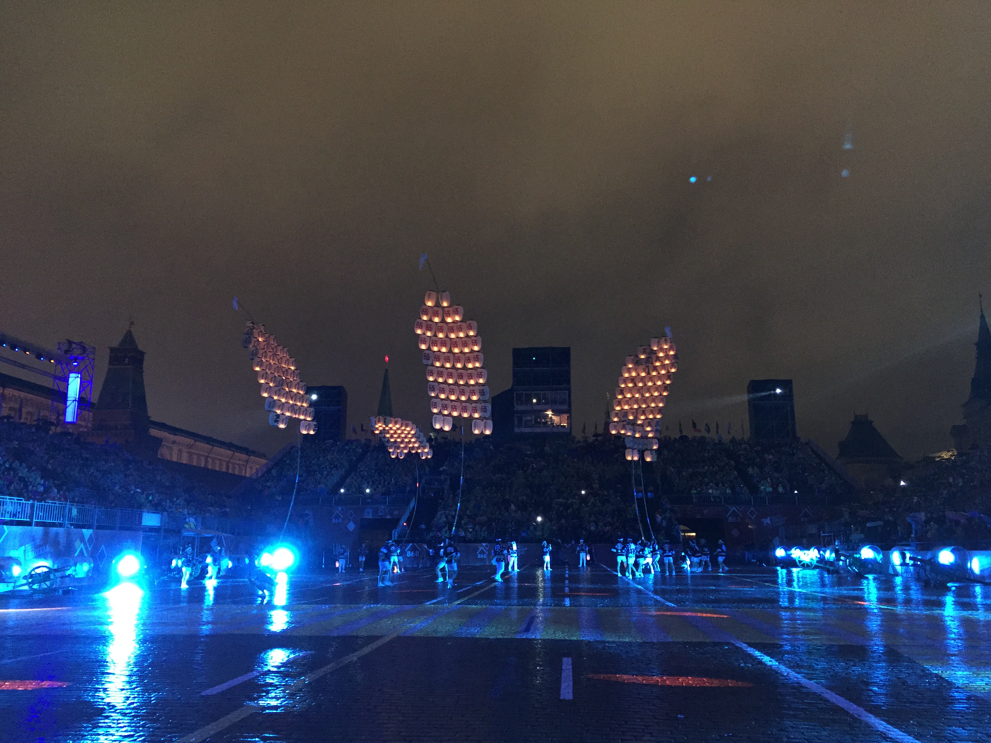 一つ目は9月5日~9月13日の13日間、モスクワの赤の広場にて開催される国際軍楽祭「スパシカヤタワーフェスティバル」での竿燈実演です。残念ながら、雨で一日中止になりましたが、招待客の中で行った総合リハーサルを含め、計4日演技を行いました。回を重ねるほどに会場や観客との一体感が増し、演技終了後は大きな拍手と「アリガトウ」、「ブラボー」、「スパシーバ」といった声援に包まれました。