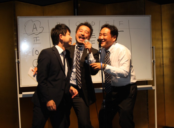 アトラクションは前回と同じ「早押し 曲当てクイズ」を行いました。早押しボタンも前回よりグレードアップさせたり、選曲に隠されたキーワードを考えてもらったり、昭和な曲に題名や曲がわからずテーブル毎で悩んだり、卒業生がステージにあがり熱唱したりと大いに盛り上がりました。