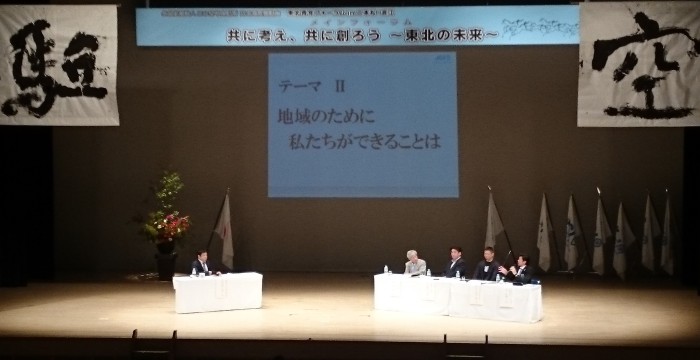6日のメインフォーラム第1部では田原総一朗氏の『夢と希望溢れる東北の実現へ!地域活性化の鍵』をテーマとした講演があり、第2部では『東北の地域再興とは』をテーマに様々な専門分野のパネリストを迎えパネルディスカッションが行われ、東北に住む私たちが手を取り合い、地域再興へ向けて進むべき方向をメンバー全員が興味深く聞き入る姿がありました。
