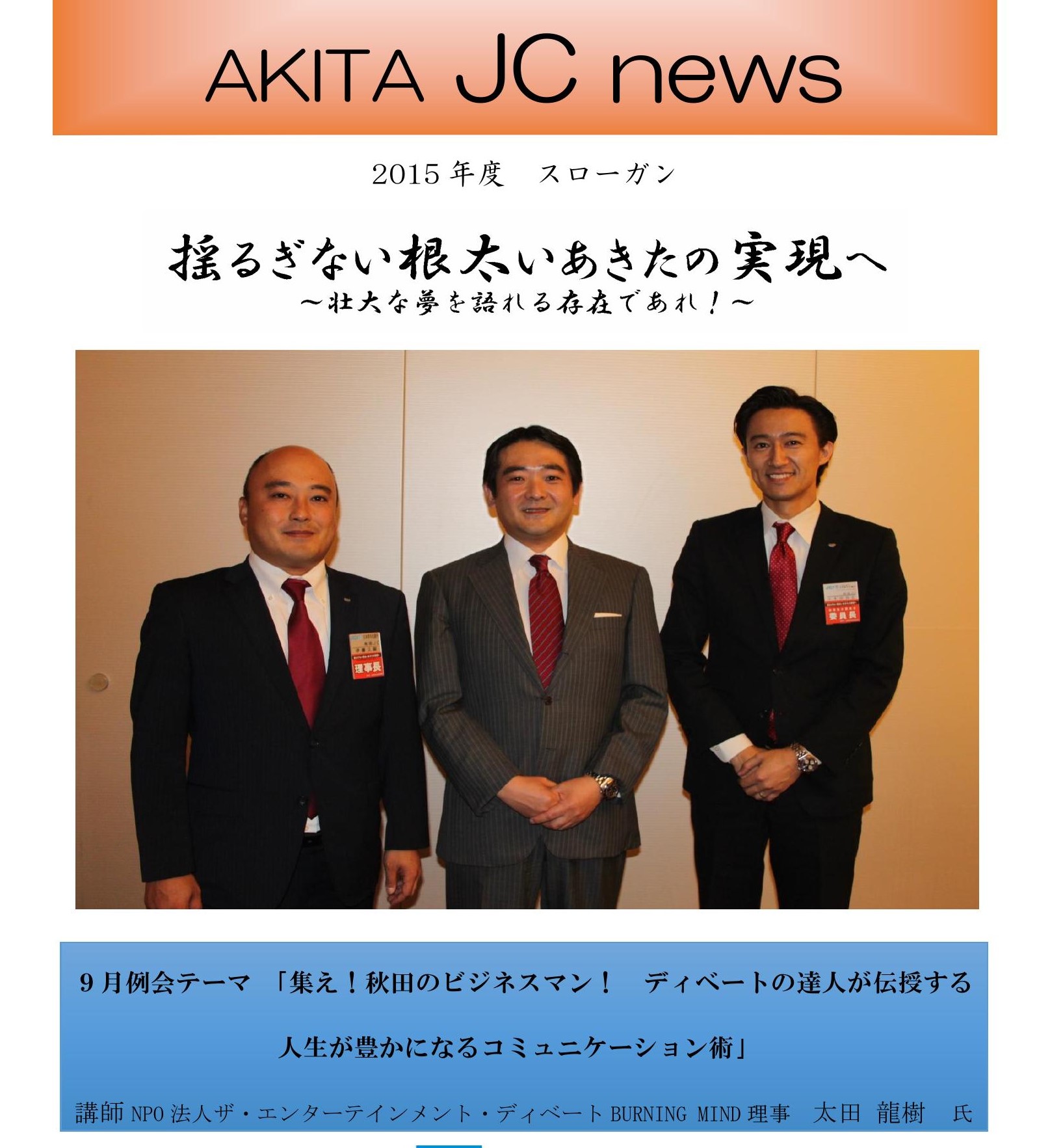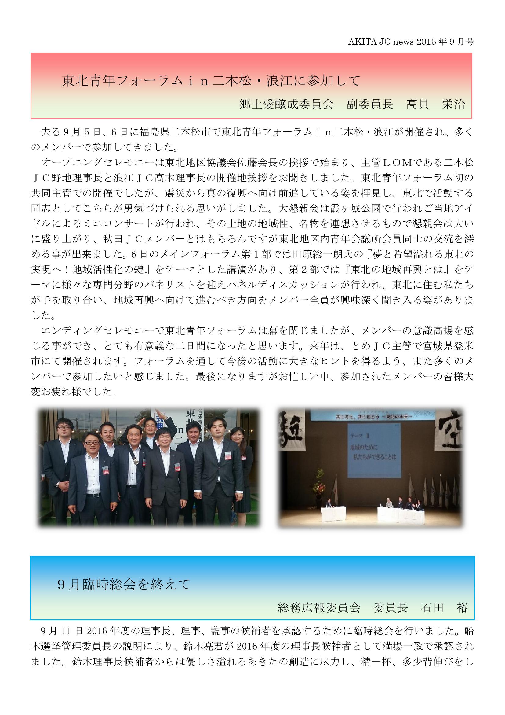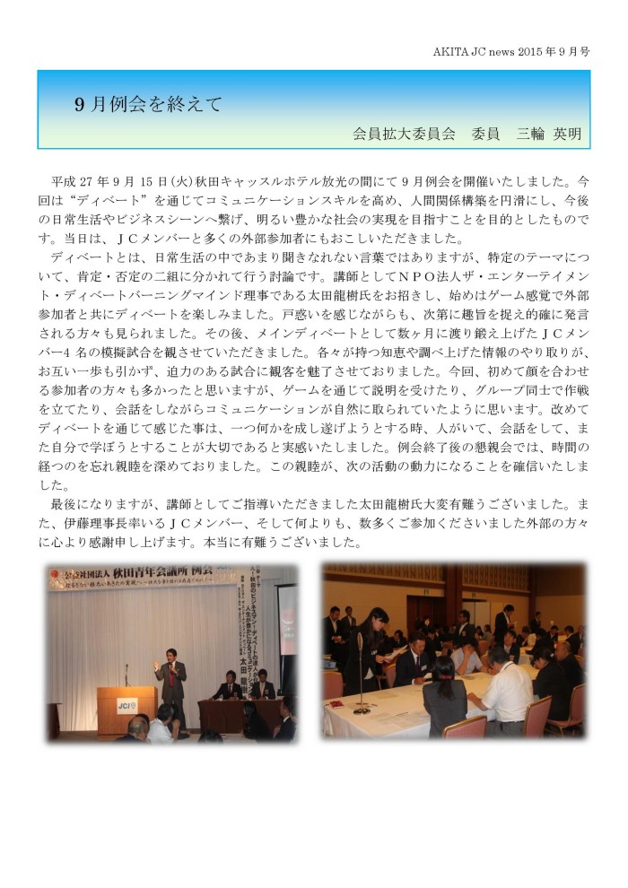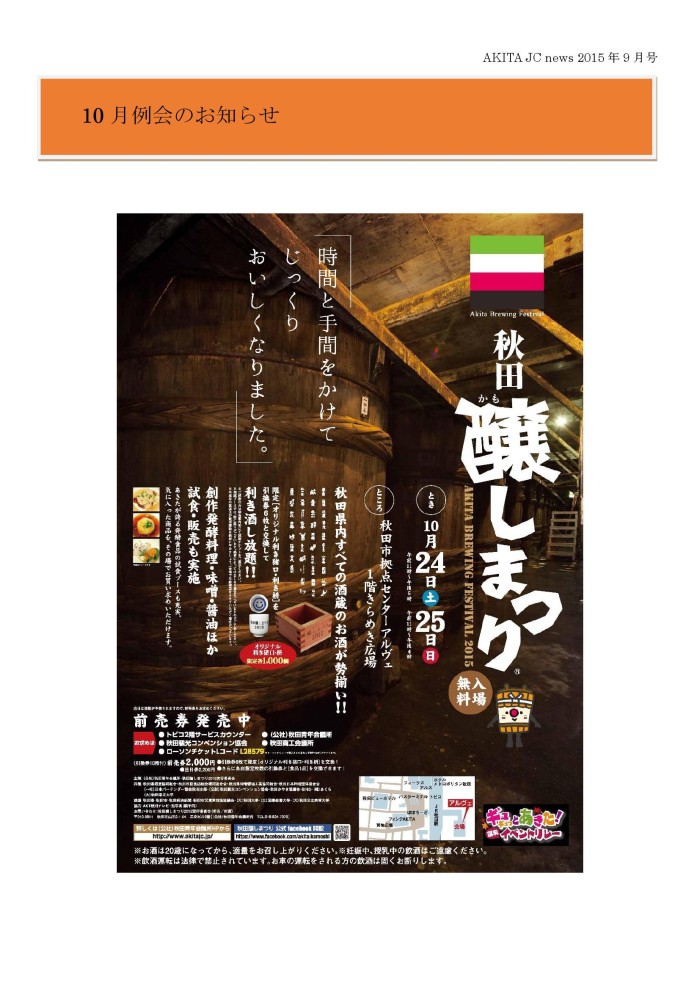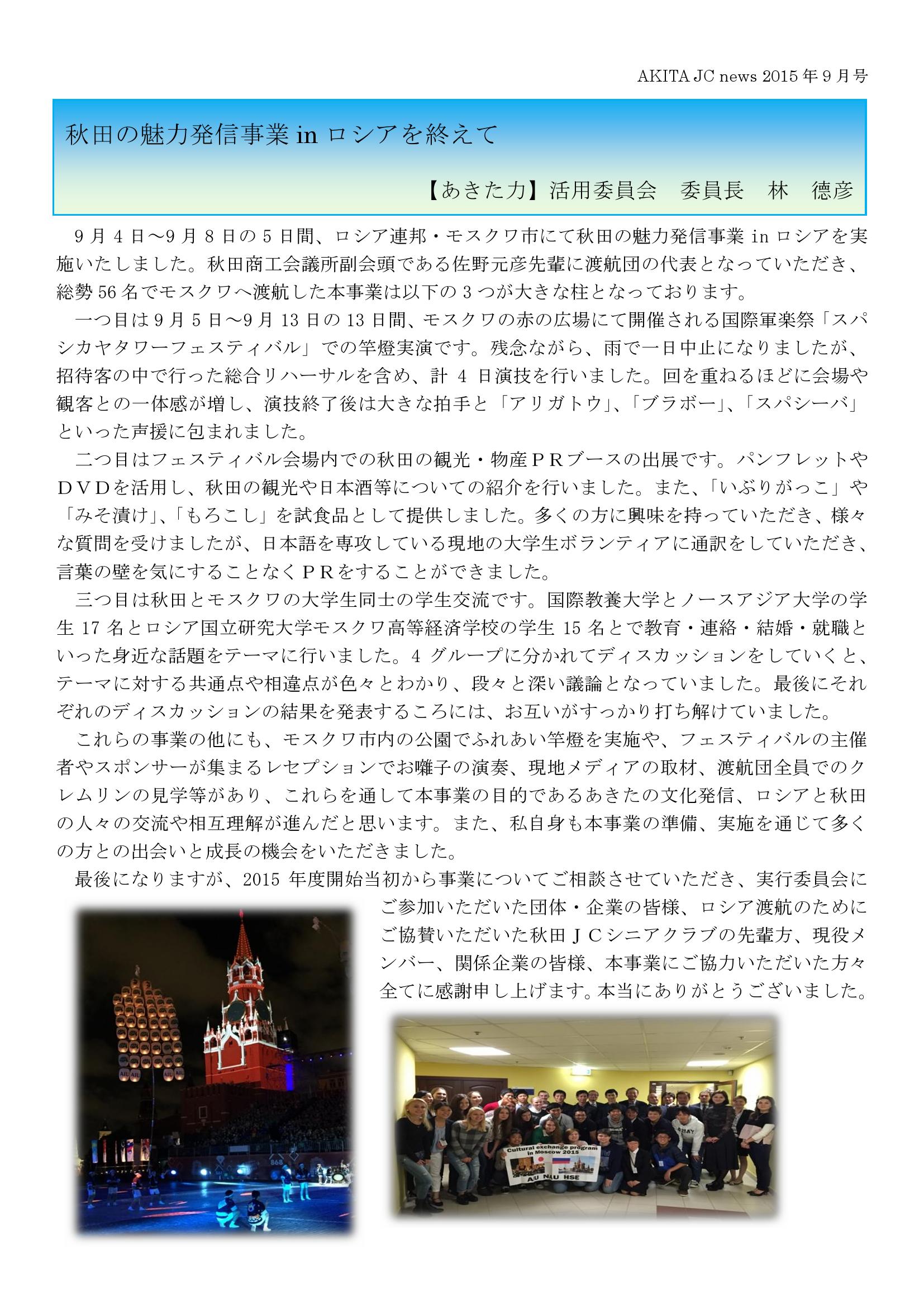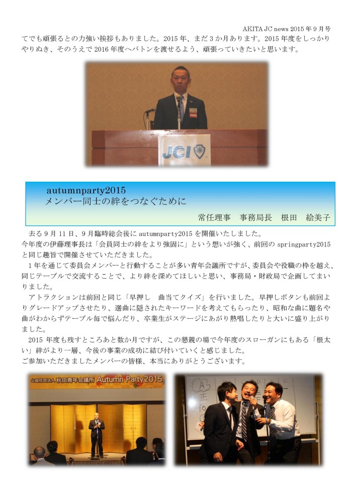 JCニュース9月号(あきたの魅力発信事業inロシア、東北青年フォーラム、9月臨時総会、autumnparty2015、9月例会、10月例会のおしらせ) 投稿日: 2015年10月25日 (Updated: 2016年1月27日) 投稿者: akitajc