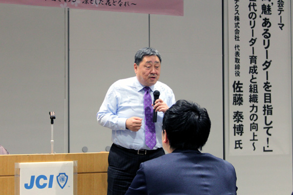 「元々、人前で話すことが大の苦手だった」と自己紹介する佐藤氏。「大勢の前でもうまく話せるようになりたい」という動機で入会したJCで、一対一の人付き合いを大切にする情に溢れた先輩と出会ったことをきっかけに人生が大きく変わった、と言います。