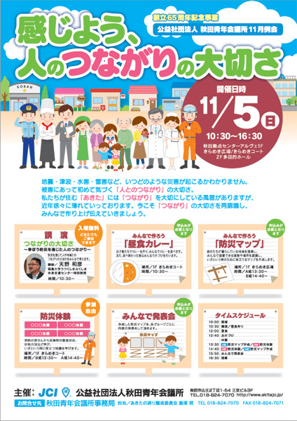 公益社団法人秋田青年会議所創立65周年記念事業として、11月例会は「感じよう、人のつながりの大切さ」をテーマに、身近な人のつながりの大切さを再認識していただくことで「人のつながり」はあきたの誇りだと感じていただく事業を開催いたします。