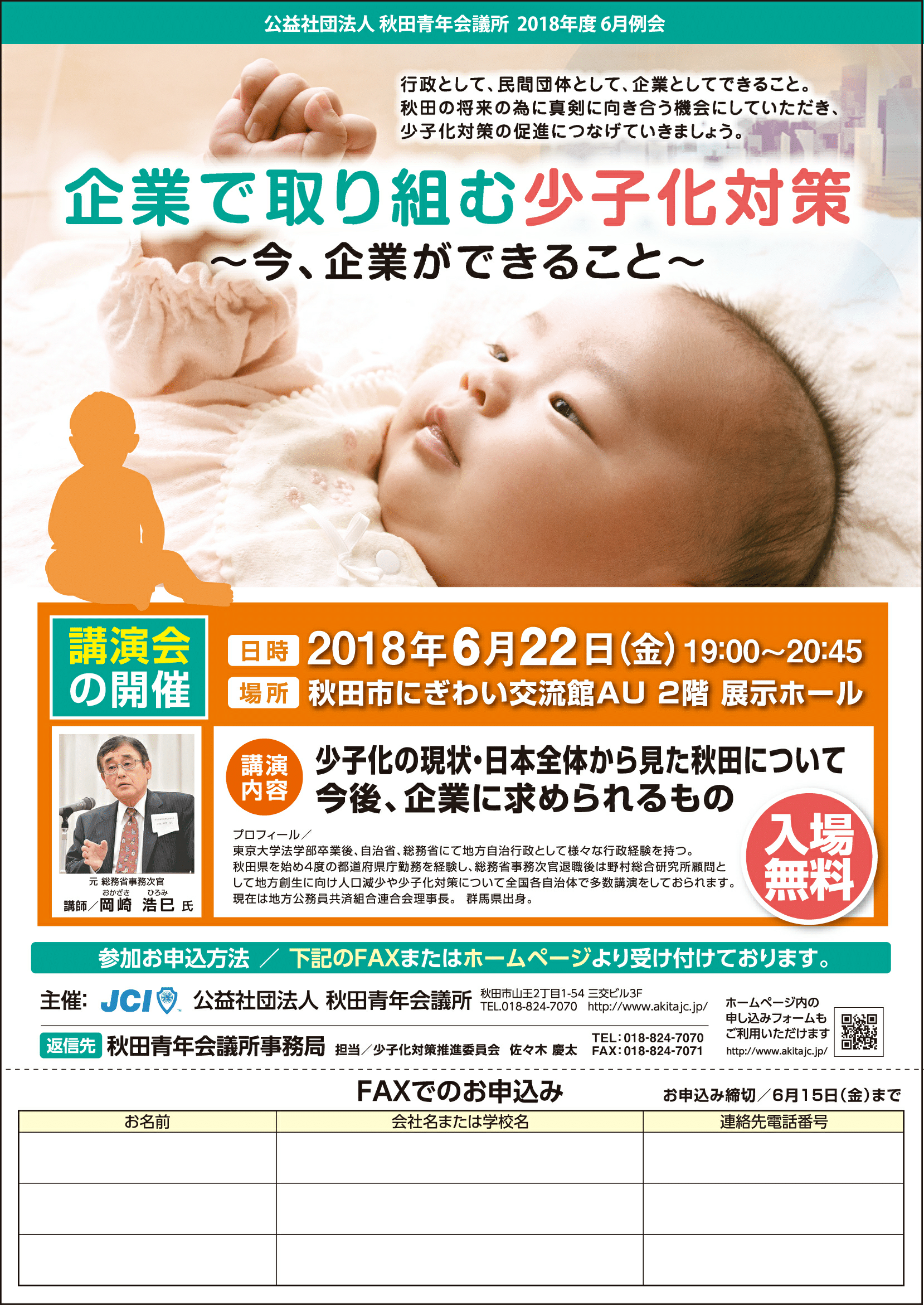 当日は講師に元・総務省事務次官 岡崎 浩巳(ひろみ)氏をお招きして、「少子化の現状・日本全体から見た秋田」 「今後、企業に求められる事」についてご講演頂きます。