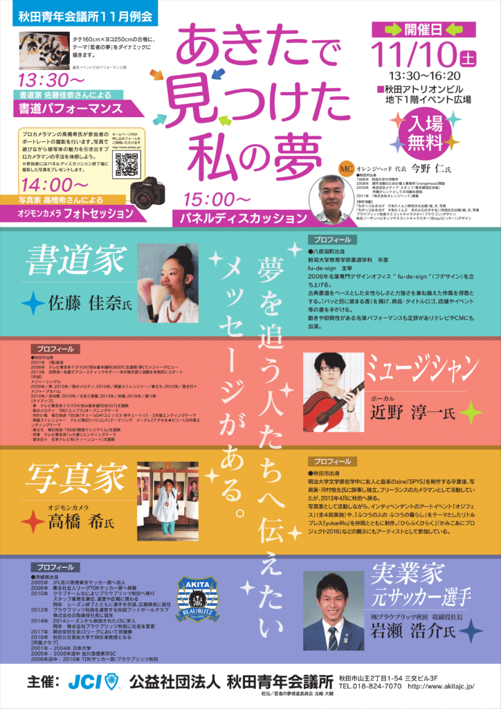 当日は各方面でご活躍の皆様をお招きし、あきたから、またはあきたで、どのようにして夢を見つけ追い続けることが出来たのか、その手段や手法について学ぶことで「あきたの若者」が夢に向かう一助となることを目指します。